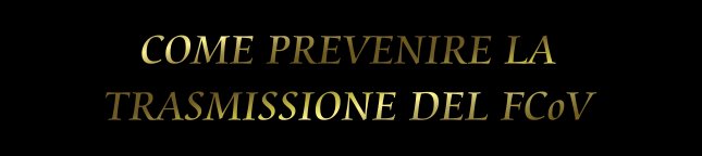 mio cane può infettare i miei gatti? Prevenzione della trasmissione del FCoV alle mostre feline Nel Regno Unito, l'84% dei gatti che partecipano alle esposizioni presentano anticorpi del FCoV. Dato che, in media, un gatto su tre con anticorpi del FCoV diffonde il virus, si può presumere che il 28% dei gatti presenti alle mostre stia ogni volta emettendo FCoV. Poiché il FCoV viene emesso principalmente nelle feci, si deve curare che i gatti alle esposizioni non condividano lettiere o palette con gatti di altri allevamenti. Occorre che i giudici ed i medici veterinari si disinfettino le mani e disinfettino il tavolo tra un esame e l’altro di ogni gatto: si ricorda che alcuni gatti all’inizio dell’infezione emettono il FCoV con la saliva. Prevenzione della trasmissione del FCoV nel maschio da riproduzione