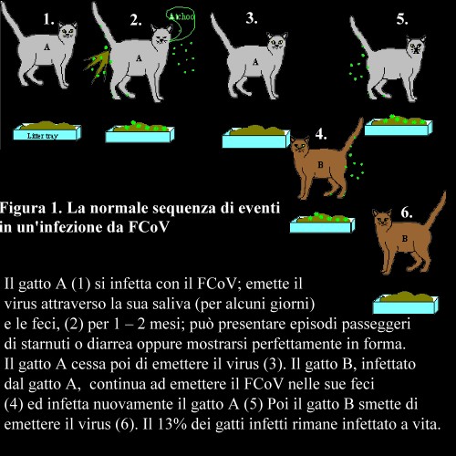 In che modo gatti e gattini prendono il FCoV? Il FCoV è un virus molto contagioso, che infetta quasi tutti i gatti con i quali viene a contatto. La fonte principale dell’infezione è costituita dalle feci dei gatti infettati; i gatti sani si infettano condividendo le lettiere con gatti infetti. La seconda più importante via d’infezione è l’esposizione non intenzionale di gatti sani a minuscole particelle di feci infette presenti su scarpe, abiti e mani di persone, su palette, ecc. È probabile che il gatto infetto ingerisca il virus durante la pulizia del pelo o durante il pasto, se particelle di feci abbiano contaminato il cibo.
