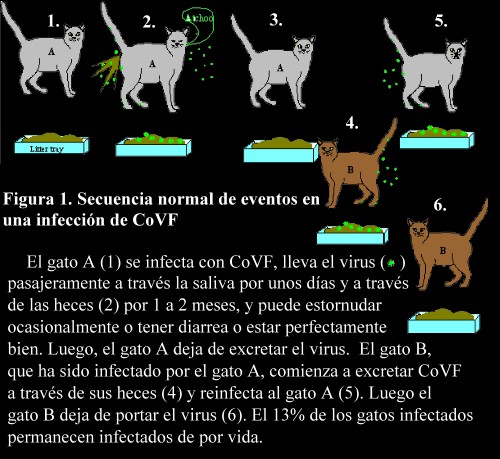 para evitar que su gato se infecte con CoVF. ¿Cuánto tiempo sobrevive el coronavirus en el ambiente? En circunstancias naturales, los gatos salen a defecar y entierran sus heces, en cuyo caso el virus permanece activo desde horas hasta días (sobrevive un poco más en condiciones de congelamiento). Sin embargo, al domesticar a los gatos, hemos introducido las bandejas de deposición: en estas condiciones, el CoVF puede sobrevivir varios días y es posible que lo haga hasta siete días en las heces resecas que se encuentran en las piedras de deposición. Si su gato ha fallecido por esta enfermedad, espere alrededor de un mes antes de traer otro a la casa. Sin embargo, si usted ya tiene otros gatos, recuerde que ellos pueden estar excretando el virus. En este caso, espere hasta que los títulos de virus se hayan reducido a cero. Y de más está decir que no debe olvidar hacerle el análisis de CoVF al gatito nuevo. Como eliminar la infección de CoVF en un criadero de gatos o en una casa donde habitan gatos La infección de CoVF puede eliminarse en un ambiente en el que habitan gatos, pero es un proceso largo y, a veces, costoso. Las casas donde habitan menos de 10 gatos a menudo se liberan espontánea y naturalmente del CoVF, pero en aquellas en las que hay más de 10 gatos, el virus puede pasar continuamente de un gato a otro (ver fig. 1) y de esta manera mantenerse la infección.